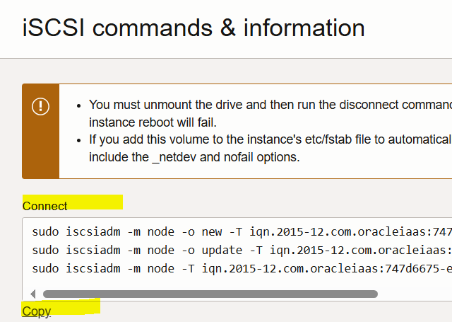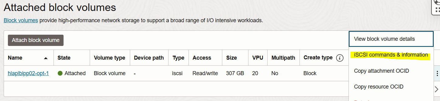 a) First click on 3 dots on the attached block volume –> iSCSI commands and information