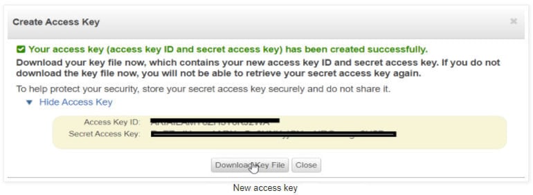 Note: You can always delete keys to recreate new ones if you reach the max amount of access keys or lost the key file.