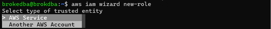 $ aws configure --profile brokedba Access Key ID: AKxxxxxxxxxxx Secret Access Key: Dsxxxxxxxxxxxxxxxxxxxxxxx Default region name [us-east-1]: Default output format [table]: