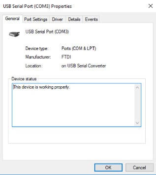 - Under “Ports (COM & LPT)”, you should notice your serial cable is recognized. In our case, it shows up as a “USB Serial Port (COM3)”