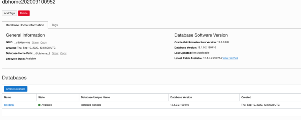 In the OCI web console, we could clearly see that it was using the image with the latest patch. If you’re reading from the phone and it is not visible for you it says “Database Version: 12.1.0.2.200714”