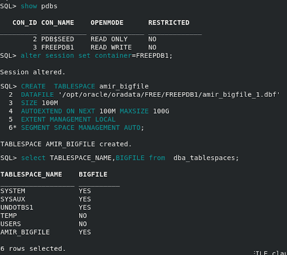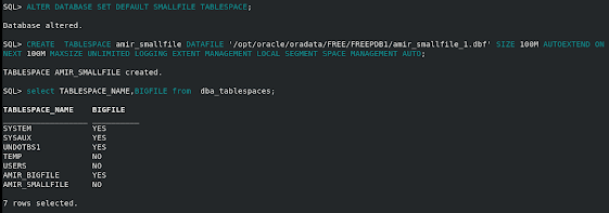 CREATE SMALLFILE TABLESPACE amir_smallfile DATAFILE '/opt/oracle/oradata/FREE/FREEPDB1/amir_smallfile_1.dbf' SIZE 100M AUTOEXTEND ON NEXT 100M MAXSIZE UNLIMITED LOGGING EXTENT MANAGEMENT LOCAL SEGMENT SPACE MANAGEMENT AUTO;