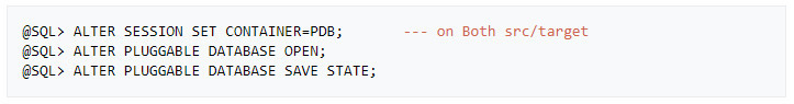 Important: First make sure that both source and target PDB open state is permanent before setting up any replication