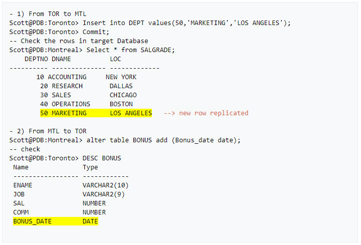 » Let’s verify if data is now replicated in both directions via an insert on the news source and a DDL on target PDB