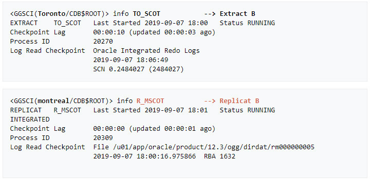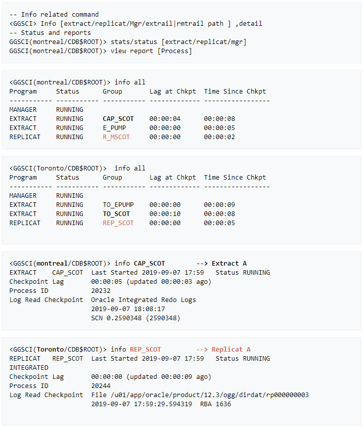 » Last but not least: Here are few GGSCI commands that help monitor the status of the replication processes.