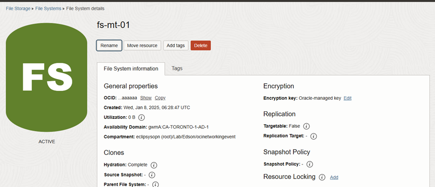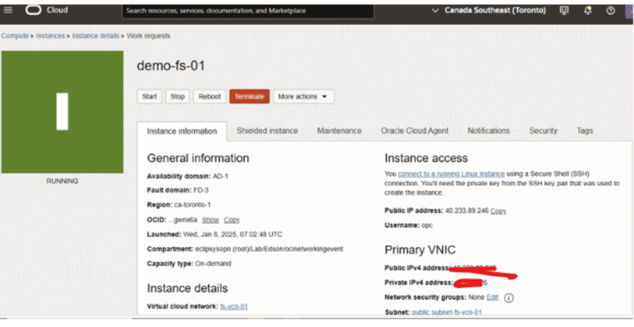 We now have a file system storage created. Next, use your SSH key pair to connect to your compute instance and mount the file system. I made a new VM demo-fs-01 for practice.