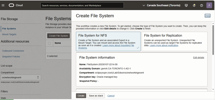 Click Create Filesystem to create a new filesystem and under Export Information, click Edit Details and change the export path to an easy-to-remember name.