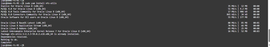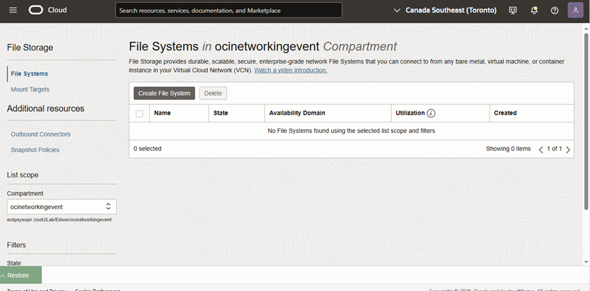 Oracle Cloud Infrastructure (OCI) File Storage Service provides a fully managed, scalable file system that enables you to store and access data on-demand in the cloud. It is ideal for applications that require file-based storage with shared access across multiple compute instances. With OCI File Storage, you can manage your data in the cloud like a traditional file system, using protocols like NFS (Network File System), making it simple to integrate into existing workflows and applications. In this blog, I have highlighted the procedure to do the following to create and mount a file storage system to a compute instance and verify the availability of the file storage system.