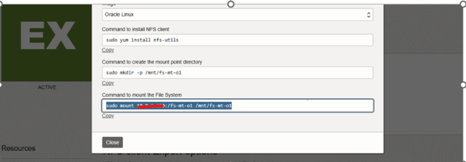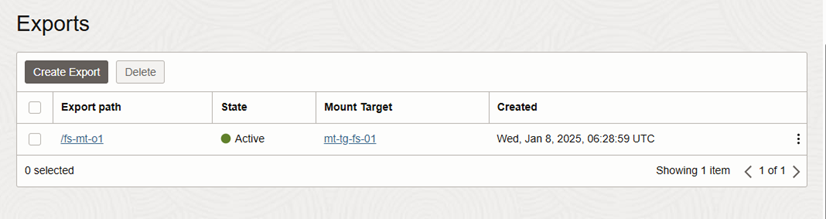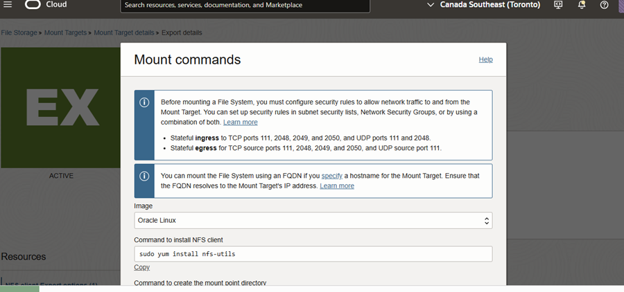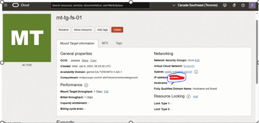 The OCI console will show your File System details. Under Exports, click your mount target name under Mount Target. In the Mount Target Details page, note down the IP Address.