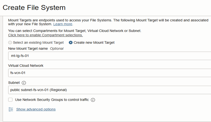 Under-mount target Information, click edit details, and click create new mount target, select the VCN you created for Virtual Cloud Network. Choose Public Subnet-YOUR_VCN_NAME (Regional) for Subnet.