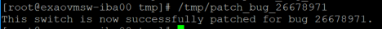 a) Copy patch on first switch in /tmp scp patch_bug_26678971 root@xx.xx.xx.xx:/tmp/. b) Change permission in /tmp chmod 770 patch_bug_26678971 c) Execute the patch /tmp/patch_bug_26678971d) Remove the patch from /tmp rm -f patch_bug_26678971