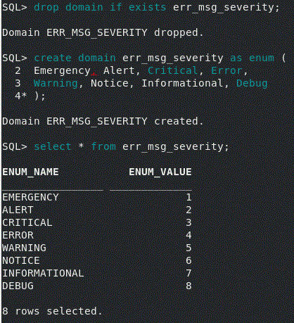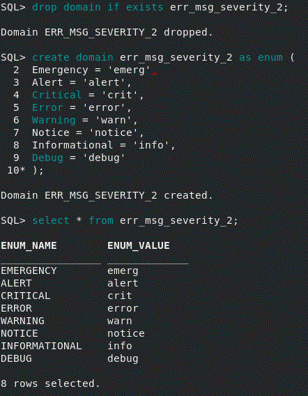 create domain err_msg_severity as enum ( Emergency, Alert, Critical, Error, Warning, Notice, Informational, Debug);