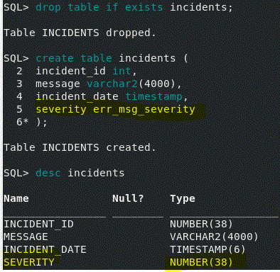 2. Create an incidents table where the severity column uses the first domain (list of numbers values)