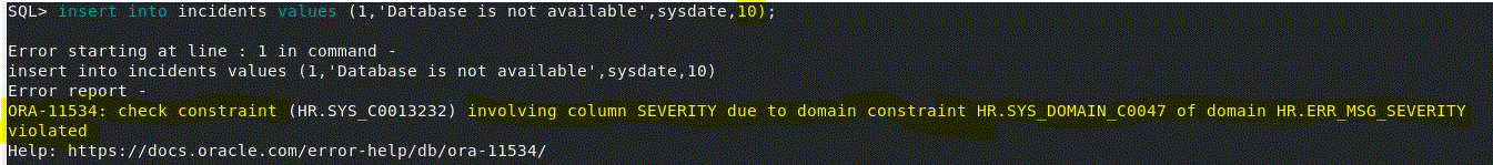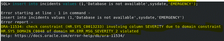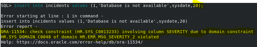 ORA-11534: check constraint (HR.SYS_C0013233) involving column SEVERITY due to domain constraint