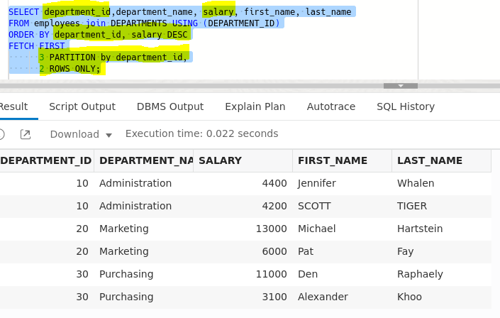 SELECT department_id,department_name, salary, first_name, last_name FROM employees join DEPARTMENTS USING (DEPARTMENT_ID) ORDER BY department_id, salary DESC FETCH FIRST 3 PARTITION by department_id, 2 ROWS ONLY;