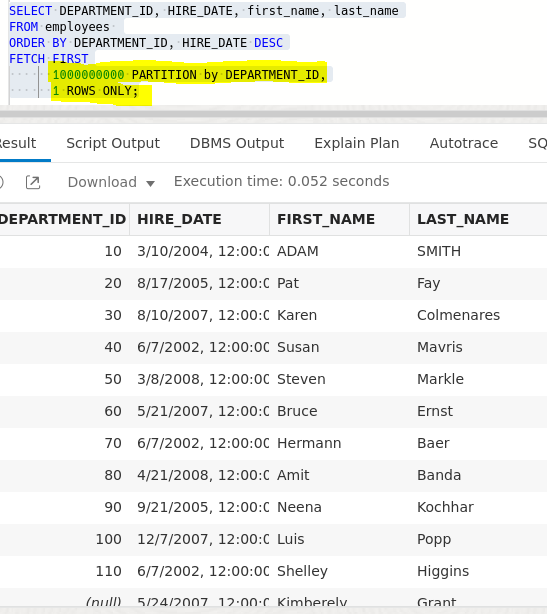 SELECT DEPARTMENT_ID, HIRE_DATE, first_name, last_name FROM employees ORDER BY DEPARTMENT_ID, HIRE_DATE DESC FETCH FIRST 999999999999 PARTITION by DEPARTMENT_ID, 2 ROWS ONLY;