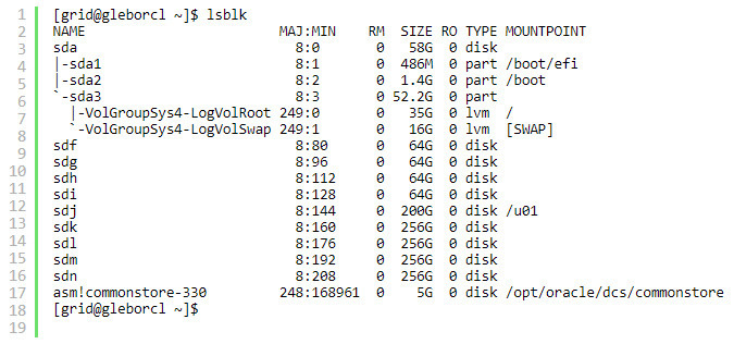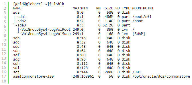 I’ve created a DBCS VM with 256GB ASM based storage for data and here are block storage volumes presented to the system: