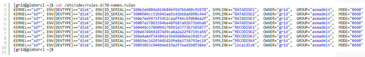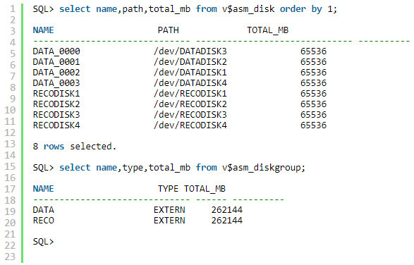 The data and reco disk groups are created with external redundancy and have four 64GB disks which give us 256GB usable space for each group. And, by the way, if you are wondering whether Oracle uses ASMLib or AFD here is how Oracle provides disks names and permissions.