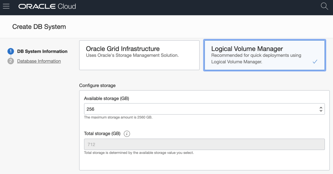 If we try to allocate the minimum size volume 256GB for an Oracle VM based DBCS it shows the total storage as 712GB.