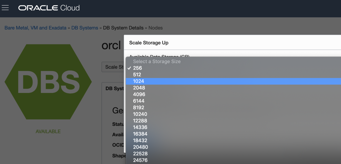 So, Oracle is using external redundancy ASM disk groups relying on the storage layer as a safety net. Planning the storage allocation is a bit tricky and we need to verify how much block storage is going to be allocated for each size of the data disk group. I tried to find it in the documentation but was not able to locate it. Probably the easiest way is to go the OCI console and push the button to scale storage for any DBCS system or the button to create a new DBCS. It will show how much storage in total is going to be allocated. I hope it might help to properly plan and estimate the cost of the resources on OCI.