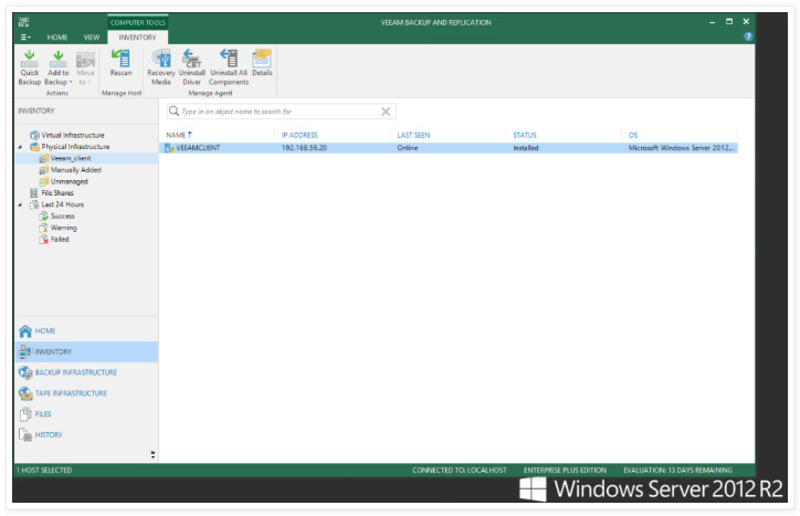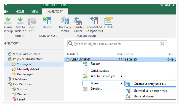 - On the inventory click on the recovery media button under our protection group (Veeam_client)
