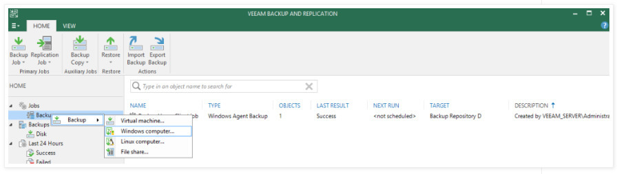 - Navigate to Home tab and select windows computer under jobs>Backups menu