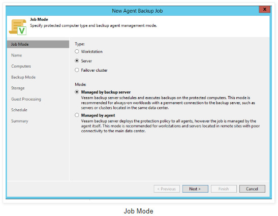 - Select Server for the protected type and Managed by the backup server as backup management mod