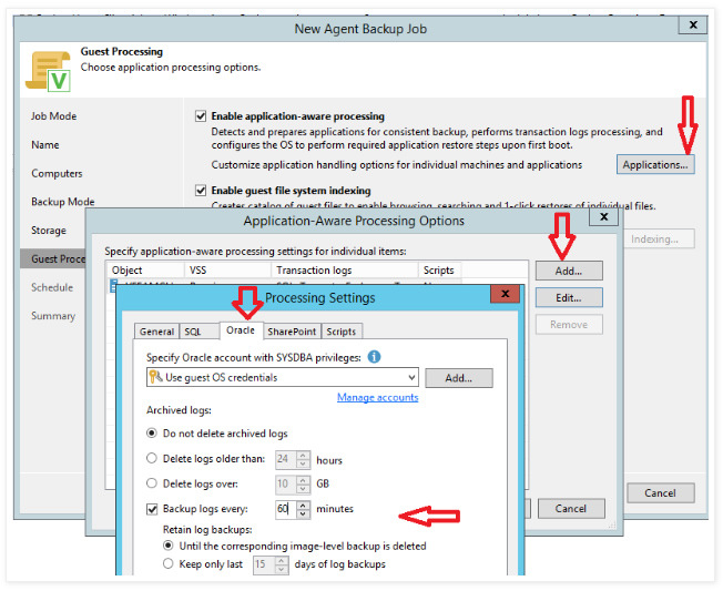 Note: I added the database SYSDBA credentials and specified the schedule and retention of archive logs backups.