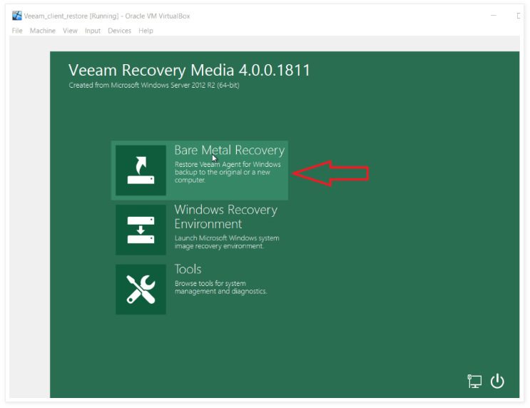 - Boot the new virtual machine. We will be prompted with the following boot menu that gathers both Windows and Veeam Recovery tools. We will proceed by choosing Bare Metal Recovery on our new virtual machine.