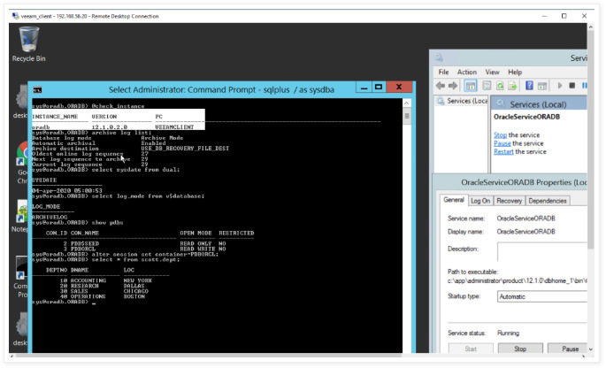 - Restart the newly restored VM. Here I used an RDP session pointing to the original IP = 192.168.56.20. After Ignoring the shutdown even tracker the database service is up and consistent (Archive mode on).